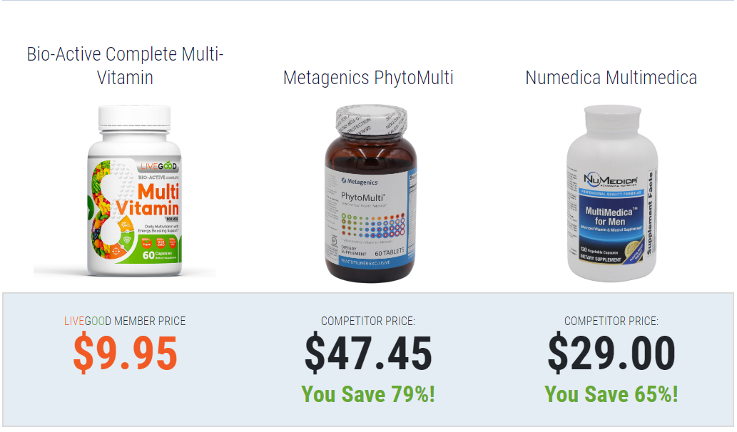Multivitamin at $9.95 with leading brands like Metagenics PhytoMulti at $47.95 and Numedica Multimedica at $29.00. With LiveGood, you save 79% and 65% respectively, making premium health accessible to all.