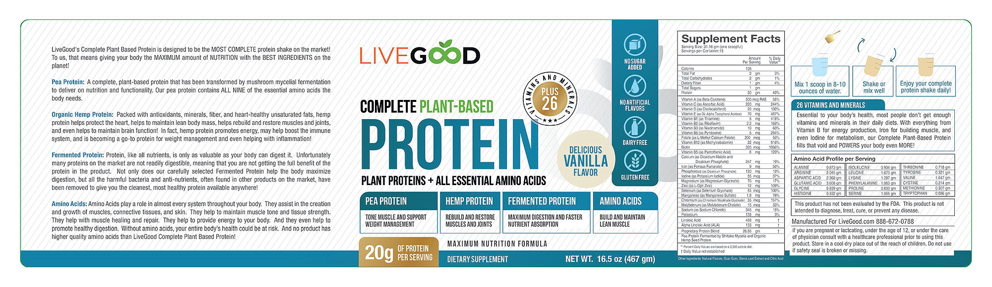 Amino acids are the building blocks of life. They facilitate muscle growth, tissue repair, energy production, and healthy digestion. LiveGood?s Complete Plant-Based Protein is rich in high-quality amino acids vital for overall health.