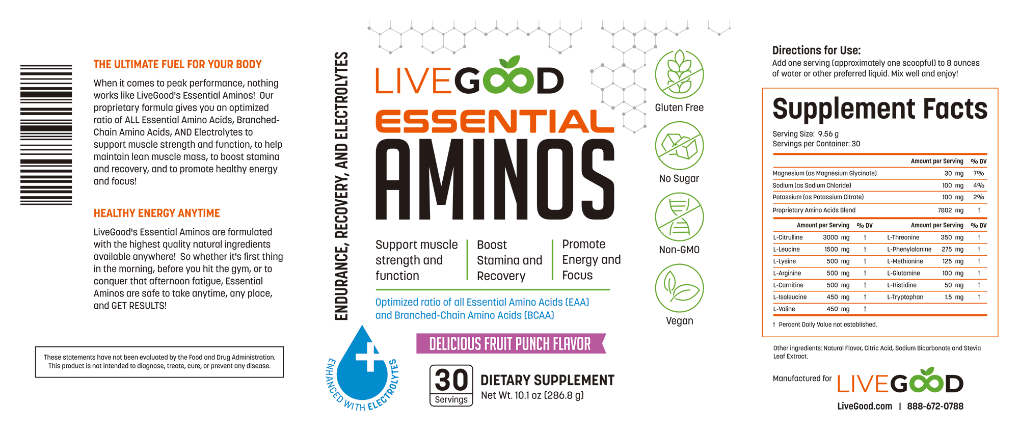 LiveGood?s Essential Aminos is not just another supplement; it?s your ticket to healthy energy no matter where you are or what time it is. Formulated with the highest quality natural ingredients available, our Essential Aminos guarantee safe and effective results. Plus, it's gluten-free, sugar-free, caffeine-free, Non-GMO, and vegan, making it the perfect choice for conscious consumers. Our product is also GMP Certified, Keto Friendly, Nut Free, Soy Free, and Third Party Tested, ensuring the utmost quality and safety.